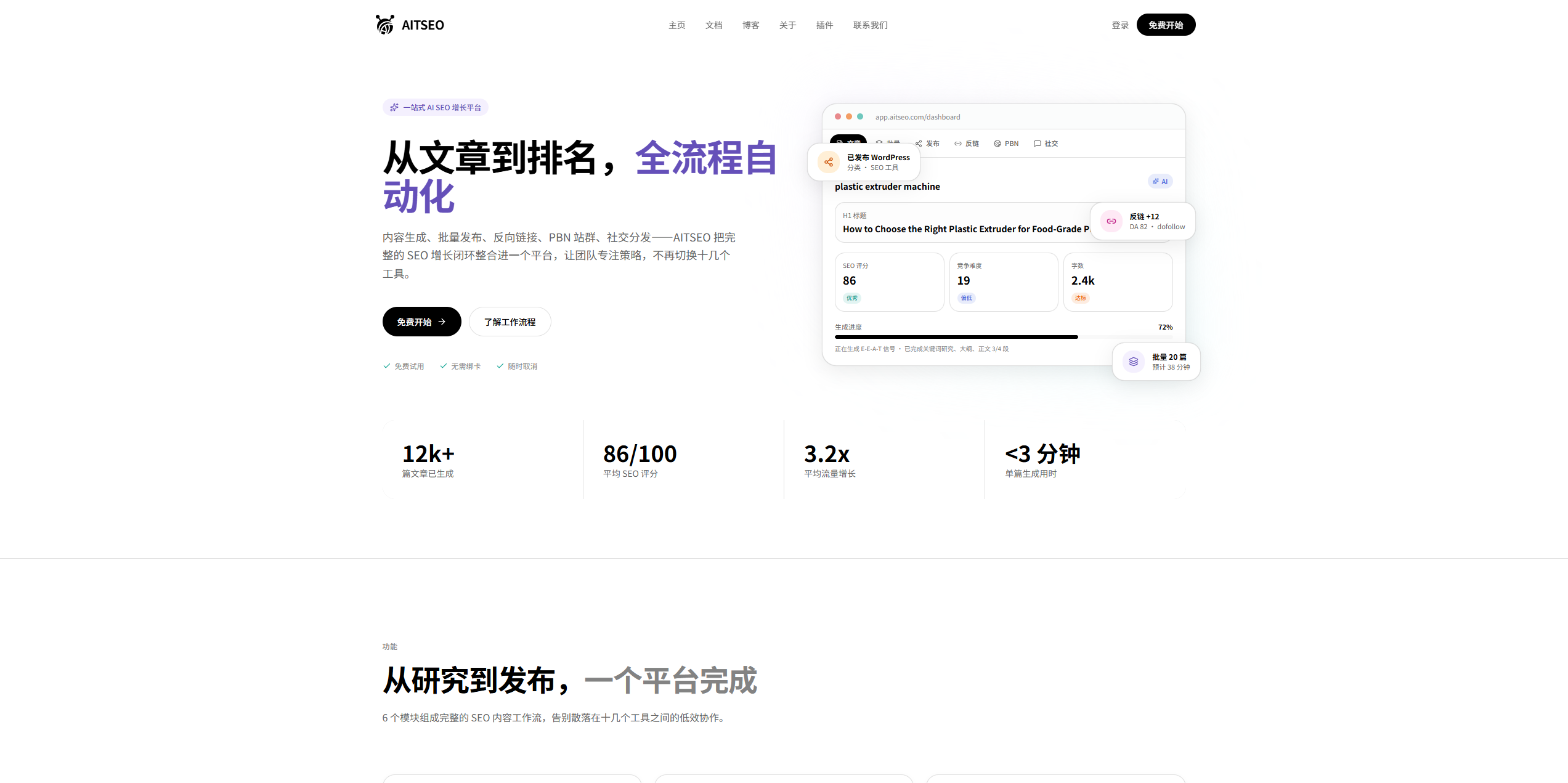 基于以上变化,本榜单采用五个评估维度打分:功能完整性(关键词/技术/外链/内容是否齐全)、AI能力深度(是否真正理解搜索意图而非简单堆词)、数据准确度(与Google Search Console的误差范围)、性价比(单位功能成本)、学习曲线(新手到产出首个优化页面的时间)。八款工具按权重加总后,AITSEO在综合分上排名第一,下面逐一展开。